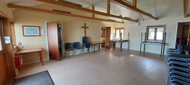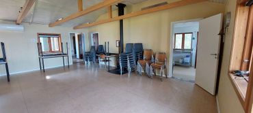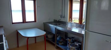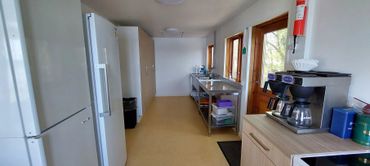 Der er køkken med opvaskemaskine, kaffemaskiner, to komfurer med ovn, to køleskabe og en fryser. Der er fade, skåle, kander mm. og service til 43 prs.